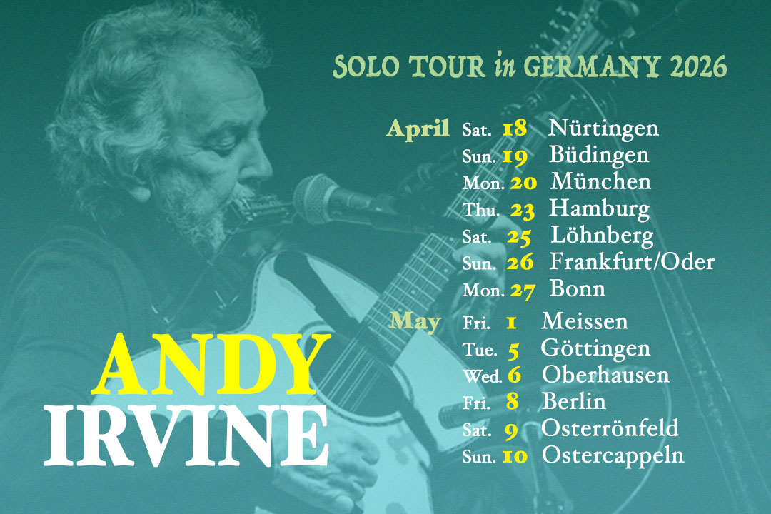 As a soloist, Andy fills the role of the archetypal troubadour with a show and a travelling lifestyle that reflect his lifelong influence, Woody Guthrie. To quote the Irish Times, "Often copied, never equalled", his repertoire consists of Irish traditional songs, dexterous Balkan dance tunes and a compelling canon of his own self-penned songs.