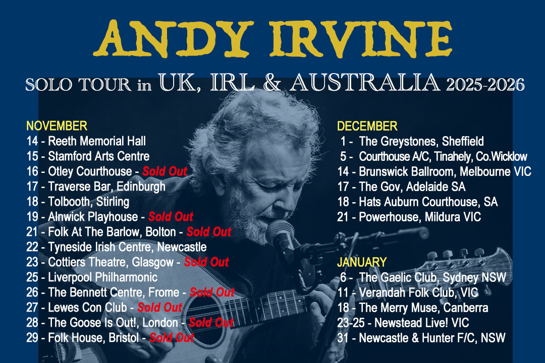 ANDY IRVINE is one of the great Irish singers, his voice one of a handful of truly great ones that gets to the very soul of Ireland. He has been hailed as "a tradition in himself".